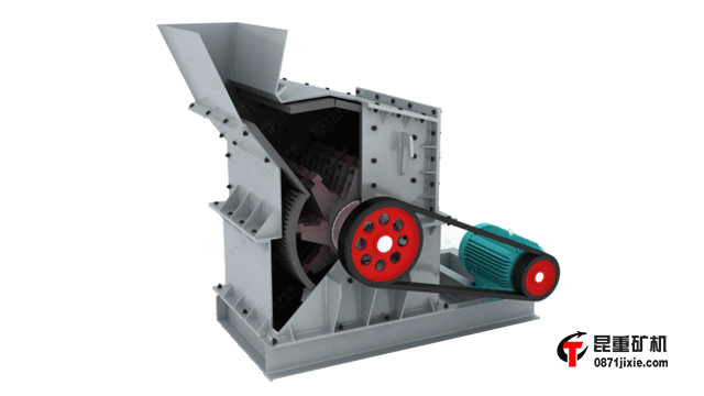 高效細(xì)碎機(jī)的主要工作部件為帶有錘子(又稱錘頭)的轉(zhuǎn)子。轉(zhuǎn)子由主軸、圓盤、銷軸和錘子組成。電動機(jī)帶動轉(zhuǎn)子在破碎腔內(nèi)高速旋轉(zhuǎn)。物料自上部給料口給入機(jī)內(nèi),受高速運動的錘子的打擊、沖擊、剪切、研磨作用而粉碎。在轉(zhuǎn)子下部,設(shè)有篩板、粉碎物料中小于篩子L尺寸的粒級通過篩板排出,大于篩子L尺寸的粗粒級阻留在篩板上繼續(xù)受到錘子的打擊和研磨,最后通過篩板排出機(jī)外。