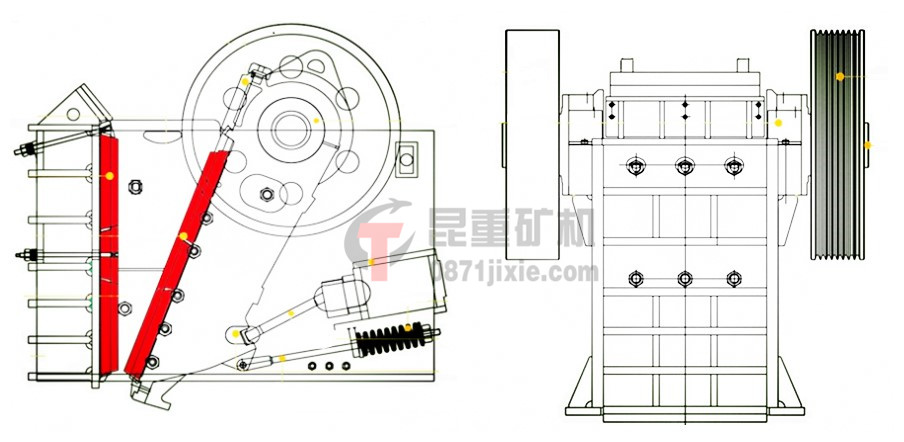 顎式破碎機(jī)的工作方式是由電動(dòng)機(jī)驅(qū)動(dòng)皮帶和皮帶輪,通過(guò)偏心軸使動(dòng)顎上下運(yùn)動(dòng),當(dāng)動(dòng)顎上升時(shí)肘板與動(dòng)顎間夾角變大,從而推動(dòng)動(dòng)顎板向固定顎板接近,與其同時(shí)物料被壓碎或劈碎,達(dá)到破碎的目的。當(dāng)動(dòng)顎下行時(shí),肘板與動(dòng)顎夾角變小,動(dòng)顎板在拉桿,彈簧的作用下,離開(kāi)固定顎板,此時(shí)已破碎物料從破碎腔下口排出。隨著電動(dòng)機(jī)連續(xù)轉(zhuǎn)動(dòng)而破碎機(jī)動(dòng)顎做周期運(yùn)動(dòng)壓碎和排泄物料,實(shí)現(xiàn)批量生產(chǎn)。