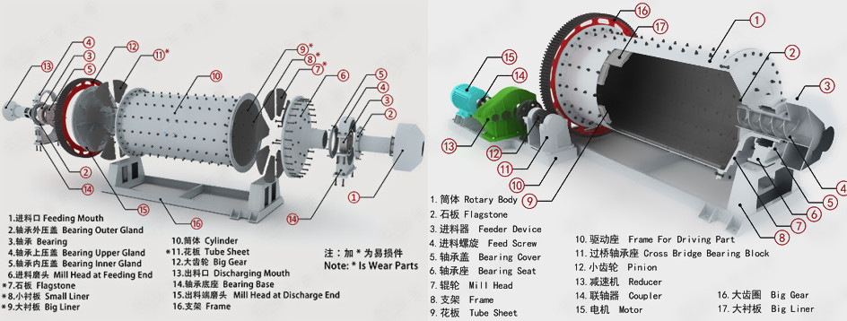 昆重礦機(jī)生產(chǎn)的濕式格子型球磨機(jī)主要是由進(jìn)料器、出料器、端蓋、法蘭盤、筒體、中心襯板(格子板)、大齒輪、傳動(dòng)總成(減速機(jī)、小齒輪、聯(lián)軸器、電機(jī))等部件組成。格子型球磨機(jī)的格子板,一般使用高錳鋼耐磨料制作,耐磨性好,使用壽命較高。