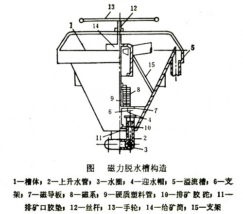 磁力脫水槽內(nèi)磁場特性應(yīng)在軸向和徑向都有梯度。在相同的條件下,軸向梯度大,徑向梯度小時(shí),磁性礦粒下降的速度較快,對(duì)提高處理能力有利。反之,徑向梯度大,軸向梯度小時(shí),磁鏈往往呈水平或近似水平狀態(tài)下降,所受到的上升水流阻力大,礦粒的沉降速度慢,影響處理能力,但此時(shí)磁鏈在下降過程中能受到較好的沖洗作用,對(duì)提高精礦質(zhì)量有利,故應(yīng)根據(jù)磁力脫水槽的不同用途來考慮磁性特點(diǎn)。