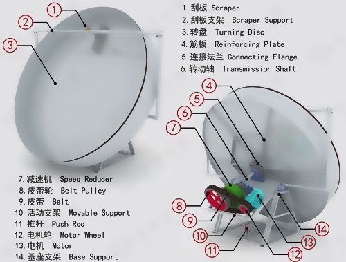 圓盤造粒機結構新穎合理,重量減輕,高度降低;工藝布置靈活方便,適合老廠改造。大盤傾角可調節(jié);采用角度墊片,調整靈活方便。采用獨特的無動力組合刮刀一體化使輔助功率消耗降低。大盤由盤體和盤節(jié)組成;降低主電機功率;盤節(jié)沿盤體可上下調節(jié);盤節(jié)端部為邊法蘭,料球出盤時可保證料球不被拉傷、撕裂。全新清淤設計,由無動力組合刮刀清邊清底,清角刮刀清盤角,配合盤體獨特處理技術,清淤、成球效果好,不會出現(xiàn)大泥團,料球直徑90%在3至5毫米。