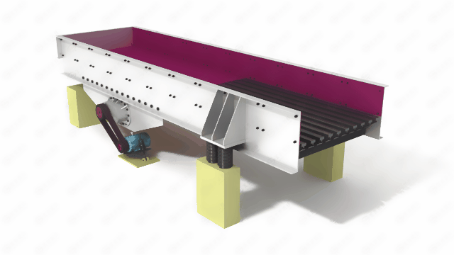 料槽配置單層篦條,可以對物料進行簡單預篩分,能有效去除原料中的細料和雜質(zhì),柵條間隙可調(diào),可防止物料堵塞。